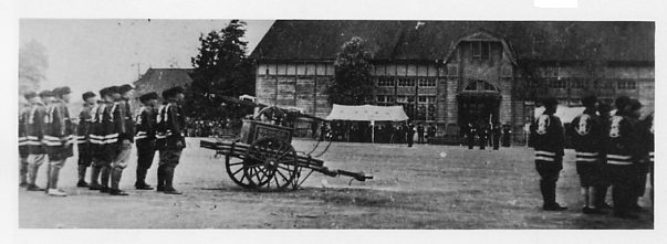 昭和26年に11月に行われた茨城県消防協会竜ヶ崎支部秋季合同検閲、竜小校庭での操法大会の様子。この大会は、ポンプにホースをつなぎ放水するまでの手順を競うものである。