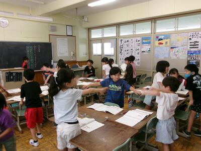 2年生は、詩を読んで体で表現する活動を行いました。大きく手を伸ばして空の大きさを表現する児童や、水をかき分ける動きでクロールの動きをする児童など、様々な動きが見られました。皆、とても楽しそうに授業を受けていました。