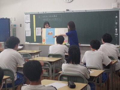 9月17日2校時に龍ケ崎市立中央図書館から2人の司書さんを招いて、3年生の家庭科で絵本作りの指導を受けました。3年生は保育実習に向けて絵本づくりを授業で行っていきます。