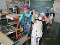 6年生の家庭科で、今年度初めての調理実習を行いました。本日は、野菜炒めやスクランブルエッグなど、班ごとに計画した料理を作りました。火の通し加減や味付けを相談しながら、楽しく学習することができました。担任も大満足のおいしさでした。おうちでも家族にふるまってほしいです。