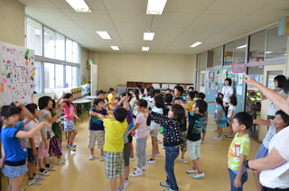 みんな大きな声で楽しく交流しました。次は,北小のみんなで「じゃんけん列車」をやりました。盛り上がったね。みんな笑顔。