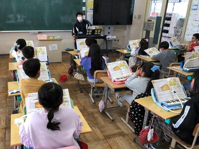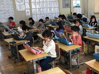 今日の2年生の音楽では、鍵盤ハーモニカの練習をしていました。先生がひく音をよく聞いて、少しずつ繰り返し練習しています。初めのうちは、音が鳴っているだけだったのが、みるみるうちに一つの曲になっていきます。反復練習を通して習得することで、音楽の楽しさも味わえるようになっていきます。どの子も「音を楽しむ」という音楽の時間になっていました。