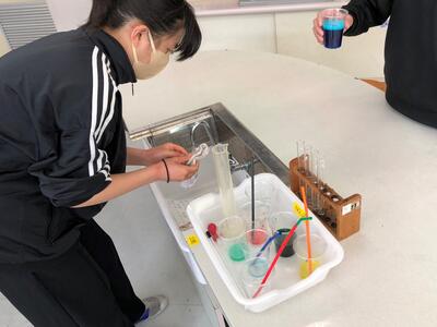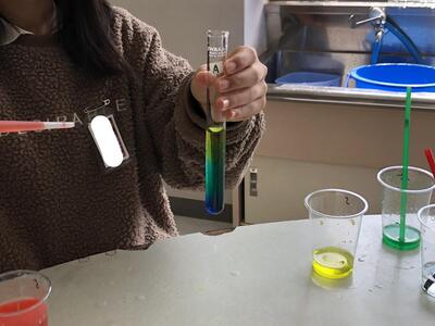 6年生の理科の授業で虹を作る実験をしていました。色を付けた食塩水の濃度を変え、試験管に順番に入れると色別に層ができ、虹のようになります。これは食塩水の濃度の違いにより重さが変わるために起こる現象だそうです。教科書にはない実験でしたが、こうやってたくさんの不思議を体験することで、理科好きな子が増えていくのだろうと思いました。