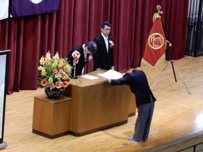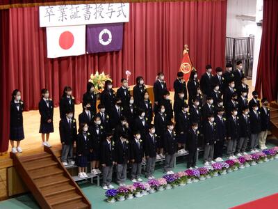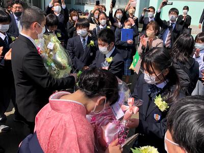 今日は第27回卒業証書授与式でした。卒業生50名は、保護者・在校生・職員に見守られ、卒業生をあたたかい気持ちで見送ろうというみんなの気持ちを受け取り、立派な態度で卒業式に臨むことができました。最後の見送りの時間の晴れ晴れとした笑顔、担任の先生方や友達と写真撮影をする笑顔、たくさんの笑顔があふれる気持ちのよい卒業式でした。卒業生たちの中学校での活躍が楽しみです。