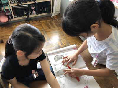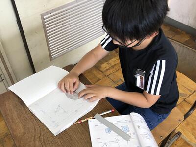 4年生の算数では、三角形の作図に挑戦していました。定規や分度器を使い、作図の手順に沿って三角形をかくことができました。4年生から使い始めた分度器の使い方もバッチリです。算数で大切なのは、授業で教わったことを自分一人でもできるようにすることです。練習問題の様子を見ていると、多くの児童が今日の学習内容を理解できていました。