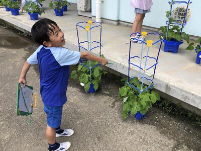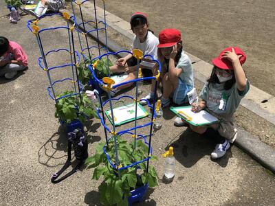 1年生がアサガオの観察をしています。この間まいた種が、毎日大切にお世話をしたのですっかり大きくなっていました。葉っぱの大きさは子供たちの手のひらよりずっと大きいです。「花はいくつ咲きそう?」と聞いてみると、「1000億個!」だそうです。大変なことになりそうですね。