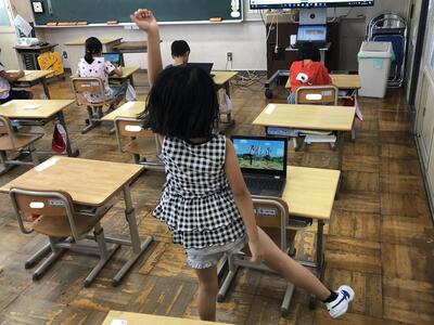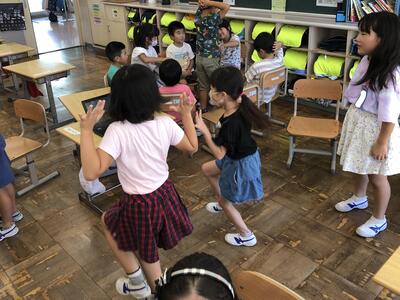 今週も残暑が厳しく暑さ指数が高いため、休み時間に外に出て遊べない日がありました。すると、子供たちは運動会で踊る予定のダンスを休み時間に練習していました。写真は1年生の教室の様子です。先生に言われたわけでもなく、動画を見ながら自主的に練習していました。楽しく踊るという、表現運動で大切なことができているようですね。