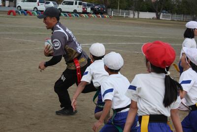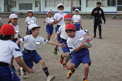 今日でタグラグビー授業も3回目で最後です。はじめの頃はボールを持って走るだけで精一杯でしたが、今日はゲーム形式で楽しむことができました。ボールを持ってトライをしたり、タックルの代わりに腰のタグを取ったりと、子供たちの覚えの速さには驚かされます。熱心に指導してくれた流通経済大学の学生さん達に感謝したいと思います。