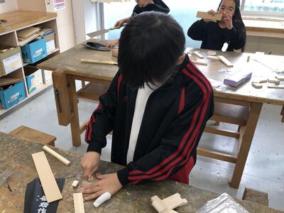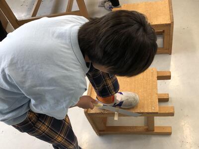 4年生の図工では、のこぎりを使って自由な形に切った木を組み合わせて、作品づくりをしています。普段、なかなかのこぎりを使う機会のない子供たちですが、一生懸命にのこぎりで木を切ったり、やすりをかけたりする活動にチャレンジしています。思い通りに切るのは難しいものの、柔軟な発想で楽しく作品づくりに取り組んでいました。