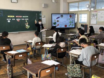 今日は5年生で食育指導を実施しました。栄養教諭の先生を講師にお迎えして、5大栄養素の働きについて学習します。身近にある食材にどんな栄養素が含まれているのかカードを使いながら学んだり、クロスワードパズルで学んだことを振り返ったりしました。今日の学習を生かして、好き嫌いせずバランスよく食べられるようにしたいものですね。