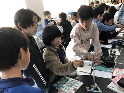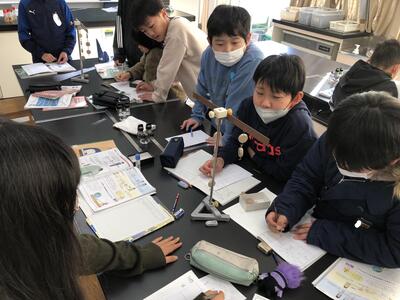 6年生の理科では、てこの学習をしています。今回は、実験用てこの左右のうでに、どのようにおもりを吊り下げるとつり合うかを調べています。実は、おもりの重さと目盛りの数で決まりがあるのですが見つかったかな?