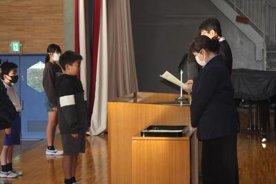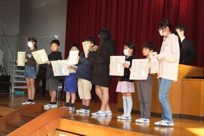 12/14に表彰式を行いました。今回は、理科作品展・発明工夫展、読書感想文、市作品展、県芸術祭、読書など、多岐にわたるものでした。表彰式で校長先生からは、自分がやりたいと思うことを一生懸命に取り組むことについて話してくださいました。自分や友達の好きなことを大切にしながら、これからも何事にも前向きに取り組んでほしいと思います。