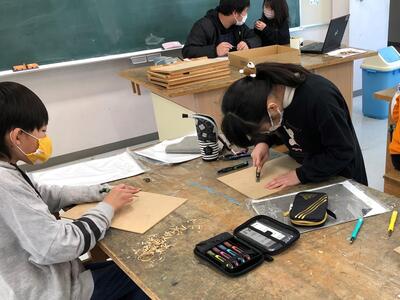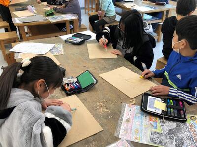 4年生の図工では木版画に挑戦しています。買ったばかりの彫刻刀を使って、ケガに気をつけながら取り組んでいます。今回は動物をモチーフにしているようで、どの子も好きな動物の絵を板に描き、丁寧に彫りすすめています。どんな作品ができるのか楽しみですね。