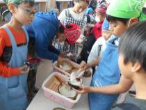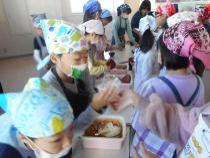 5年生の「総合的な学習の時間」で米作りをしてきました。先日収穫したお米を使っておむすび作りをしました。米作りの指導をしてくださった佐藤さん,田植えや稲刈りを手伝って下さった熊谷さんをお招きして,一緒に収穫の喜びを味わいました。自分たちが作ったお米です。味も格別だったことと思います。楽しく,和やかなひとときでした。