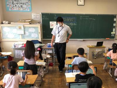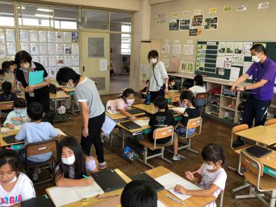 先生たちは、「どうしたらいい授業ができるか」、「どうしたらいい学級にできるか」など、毎日考えています。今日は、他の先生の授業を見て、いいところや課題を考える研修をしました。写真は、2年2組での研修の様子です。授業の関係で見に行くことができなかった先生は、録画した動画を見て、後日研修します。
