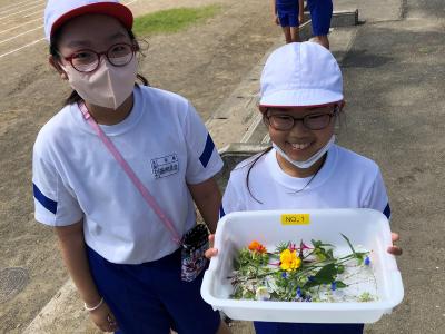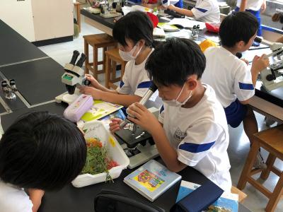 5年生の理科では、植物の実や種子はどのようにできるのかについて学習しています。これまではアサガオについて学習してきましたが、学習したことを広げるために、校内にある色々な花の観察に取り組んでいました。「学校にこんな花もあるんだ」「こんな花も見つけたよ」など、子供たちの意欲的な声が聞こえてきます。花を採集したら、顕微鏡で観察です。アサガオとの違いは何でしょうか?