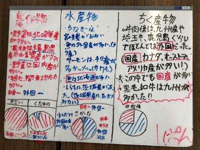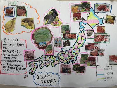 5年生の社会では、スーパーなどのチラシを切り抜いて日本地図にペタペタ貼っていました。何をしているのかと聞くと、「スーパーの食料品がどこでとれたものなのか調べているんです」とのこと。自分たちで集めたチラシを使って学習すると、やる気も違って見えます。この後は、調べたことについて発表会をするそうでその準備も頑張っていました。