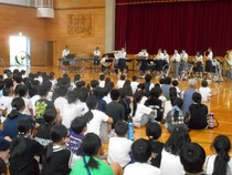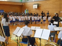 中根台中学校吹奏楽部の先輩方が久保台小体育館で出前演奏会を開いてくれました。生の楽器の演奏にうっとりと聴き入る様子が見られました。途中、カチューシャなどを身に付け、ディズニーメドレーのコーナーがあったり、全員で「ビリーブ」を合唱するコーナーがあったりと様々な演出で小学生を楽しませてくれました。