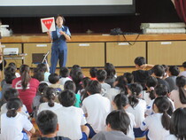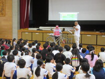 全校児童を対象に交通安全教室を実施しました。講師として竜ケ崎警察署交通課の職員さんに来校していただき、動画を交え、低学年から高学年まで交通安全について意識を高めました。低学年では、横断歩道の渡り方を演習しました。また、自転車に乗る前の確認事項「ブタはしゃべる」(ブレーキ、タイヤ、ハンドル、車体、ベル)についても知ることができました。