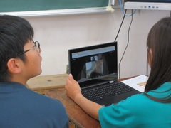 高学年における外国語の授業で、外国人とオンラインで繋げてコミュニケーションを図る「オンラインブレンデッド授業」が実施されました。あらかじめ準備していた話題や質問について身振り手振りを交えながら伝えようと頑張る様子が見られました。学習後には、英語で伝える難しさと伝わった際の喜びを友達と分かち合っているようでした。