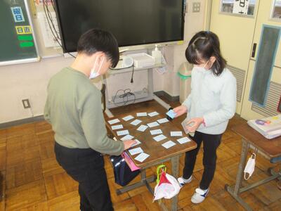 4年生の国語では百人一首について学習します。そこで、小学生でも取り組みやすい「五色百人一首」を使って、百人一首に親しむことにしました。始めのうちは下の句を読むまで札を取れなかったのですが、慣れてくると上の句の言葉だけで札を取れる子も増えてきました。歌を覚えるとますます楽しくなるので、みんな夢中で取り組んでいます。