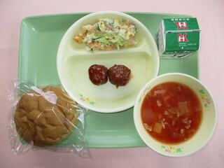 宇治抹茶パン・牛乳・ミートボール・ツナサラダ・ミネストローネ
