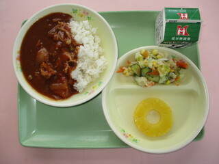 ハヤシライス(麦ご飯)・牛乳・コーン入りサラダ・パインアップル