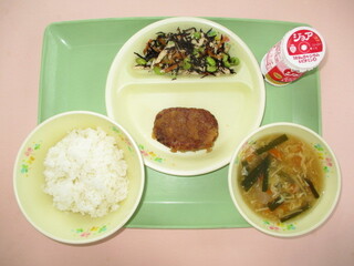 ご飯・発酵乳(いちご)・ハンバーグおろしソースかけ・鶏ささみの彩りサラダ・にら玉汁