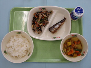 ご飯・発酵乳(プレーン)・いわしのおかか煮・金平風ひじきと大豆の五目煮・カレー肉じゃが
