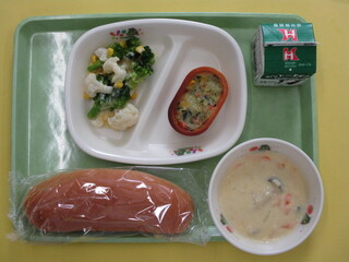 コッペパン・牛乳・米粉グラタン・花野菜サラダ・コーンチャウダー・