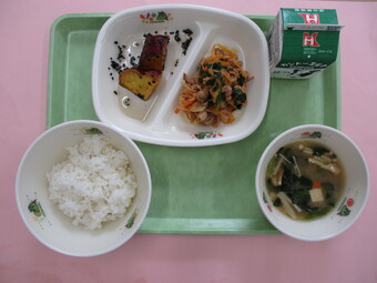 ご飯・牛乳・豚キムチ・大学いも・小松菜の味噌汁