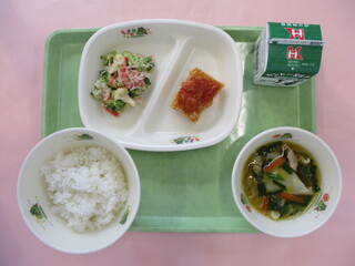 ご飯・牛乳・いかのチリソース・かにかまサラダ・ワンタンスープ