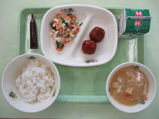 ご飯・牛乳(ミルメーク)・肉団子・ごま香るちくわサラダ・白菜と厚揚げの味噌汁