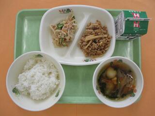ご飯・牛乳・かみかみ肉そぼろ・切り干し大根とツナのサラダ・いも団子汁