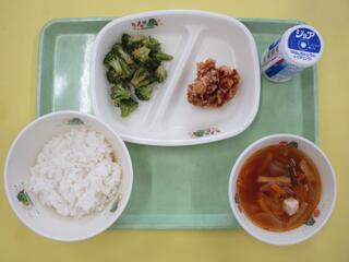 ご飯・発酵乳・鶏肉のから揚げ・ブロッコリーのおかか和え・キムチスープ