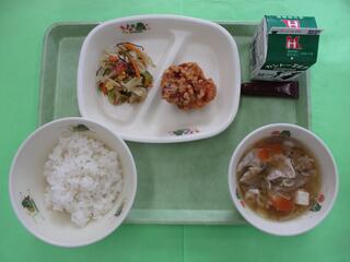 ご飯・牛乳・ミルメーク(ココア)・鶏肉のから揚げ・りっちゃんサラダ・豚汁