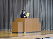 修了式の前に「生徒会からのお知らせ」と「表彰式」を行いました。生徒会からは、「生活の約束」の改正について説明がありました。表彰式では、市体育協会優秀賞、防犯ポスター優秀賞、みんなで読む一冊の本の県知事賞と県教育長賞の表彰を行いました。さらに、NIEコンクールで表彰を受けた職員、県の教育に貢献し感謝状を受けた職員についても生徒の前で表彰しました。皆、温かい拍手を送っていました。