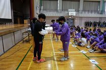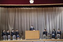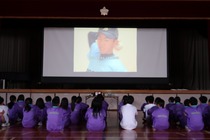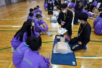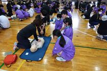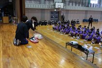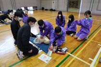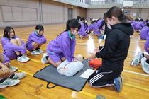 流通経済大学スポーツ健康科学部教授の稲垣先生と、学生さん約40名をお招きし、2年生で救急救命講習会を行いました。生徒たちは、「助かる命を救う大切さと勇気」の重要性について知り、学生の皆さんから胸骨圧迫とAEDを教えていただきながら体験しました。