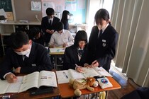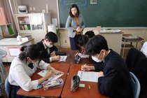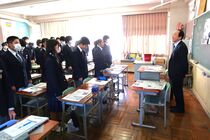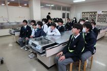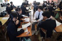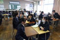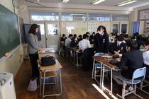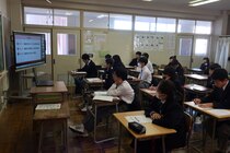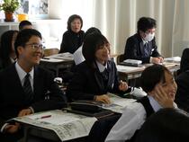 1年生では、新規採用の教員が数学の授業をしていました。空間図形の学習で、生徒たちは楽しく問題を解いていました。進んで学び合いの形を入れて頑張っており、学び合う集団が形成されていました。