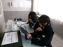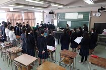 本校の校歌は、作曲家の三枝成彰の作曲によるもので、とても素敵です。生徒たちも校歌を自慢と思っており、行事や集会など全校が揃うときには必ず歌います。また、伴奏(メロディ)が難しいにもかかわらず生徒が演奏します。音楽の時間では、校歌からスタートします。5校時、音楽室に行くと、合唱の上手い3年生たちが歌っていました。3年生たちが校歌を歌うのもあと少しですね。