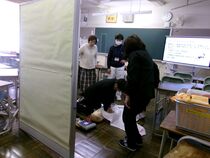 今日は、アレルギー対応に関する研修を行いました。実際に生徒のアナフィラキシー症状が認知されば場合、どのような対応をする必要があるのかを養護教諭から説明を受け、実際に行動してみました。さらに、若い職員に対して、龍ケ崎消防署からお借りした訓練用エピペンを使用して、打ち方の実習も行いました。