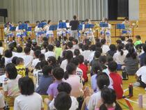 城西中学校吹奏楽部の皆さんが、出前演奏会に来てくれました。「崖の上のポニョ」「名探偵コナンのテーマ」「RPG」など、子供たちも聞き覚えのある曲を演奏してくれました。子供たちは、手拍子をしたり体でリズムをとったりしながら、演奏を楽しんでいました。また、吹奏楽部には馴柴小の卒業生も多数在籍し、演奏終了後には関わりのあった先生方との再開を楽しんでいました。気温が高く暑さが心配される中でしたが、卒業生の活躍する姿も見られ、とても楽しいひとときになりました。