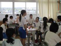 毎年川原代小学校の同学年児童とは交流活動を行っている子供たちですが、中学生も交わっての交流活動に初めはとても緊張している様子が見られました。しかし、授業が進むにつれて少しずつ意見を交換する姿が増えました。