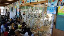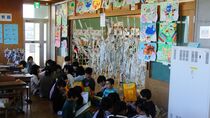 11月26日(火曜日)、2年生が川原代小学校との交流活動を行いました。今年度の活動は、図工の「つないでつるして」です。各自が用意した新聞紙を細長く裂いて、川原代小学校の友達も交じっての制作活動は、子供たちの発想が生かされた素晴らしい作品づくりになりました。最後は3つの教室に飾られた作品をお互いに見合う鑑賞会を行い、活動を終了しました。