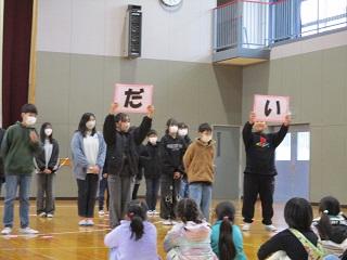3月になりました。今日は卒業式を今月迎える6年生に向けた「6年生を送る会」が行われました。器楽クラブの演奏で入場した6年生に向けて、各学年が合唱や群読、劇やダンスで感謝の気持ちを表現していました。6年生からのお礼は「馴馬台小学校のよいところ」の紹介と、ソーラン節でした。5年生を中心に企画された温かいひとときとなりました。
