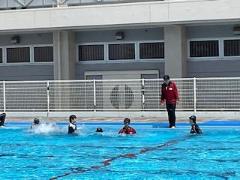 その後、イカのように泳ぎ、体力の消耗を抑える「エレメンタリーバックストローク」を学習しました。