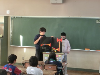 本日の朝の時間に、図書委員会の5年生が1年生教室へ行き、大型絵本を使った読み聞かせを行いました。
