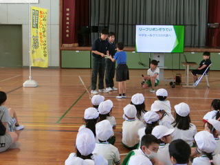 また、各クラスの代表の児童が、企画委員の児童から、リーフリボンを受け取りました。