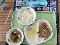 今日の献立は、ごはん、キムタク炒め、豆腐とわかめの味噌汁、牛乳、ソーダゼリーミックスです。