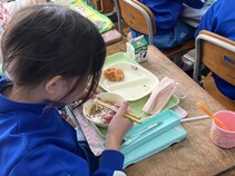 今日はいばっぺごはんの日です。今日の食材は、すべて龍ケ崎市や茨城県で生産された食材を使って調理されています。今日の献立は、ご飯、牛乳、ヤンニョムチキン、小松菜ともやしのナムル、県産和牛のユッケジャンでした。みんなでおいしくいただきました。給食センターの皆さん、ごちそうさまでした。